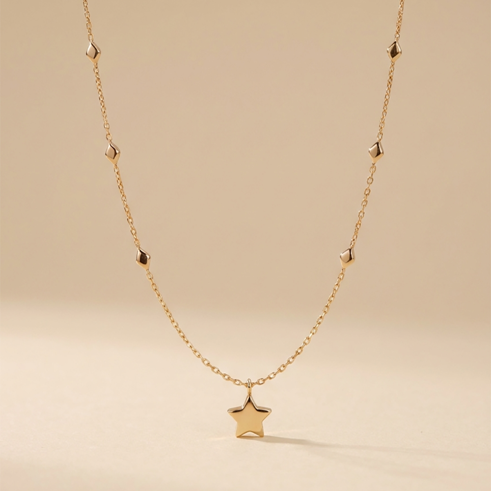 • گردنبند تمام لوزی و ستاره برجسته به طول حدود 42 ، ابهاد لوزی حدود 0.3*0.2، ستاره به قطر حدود 0.6 سانتی متر می باشد.