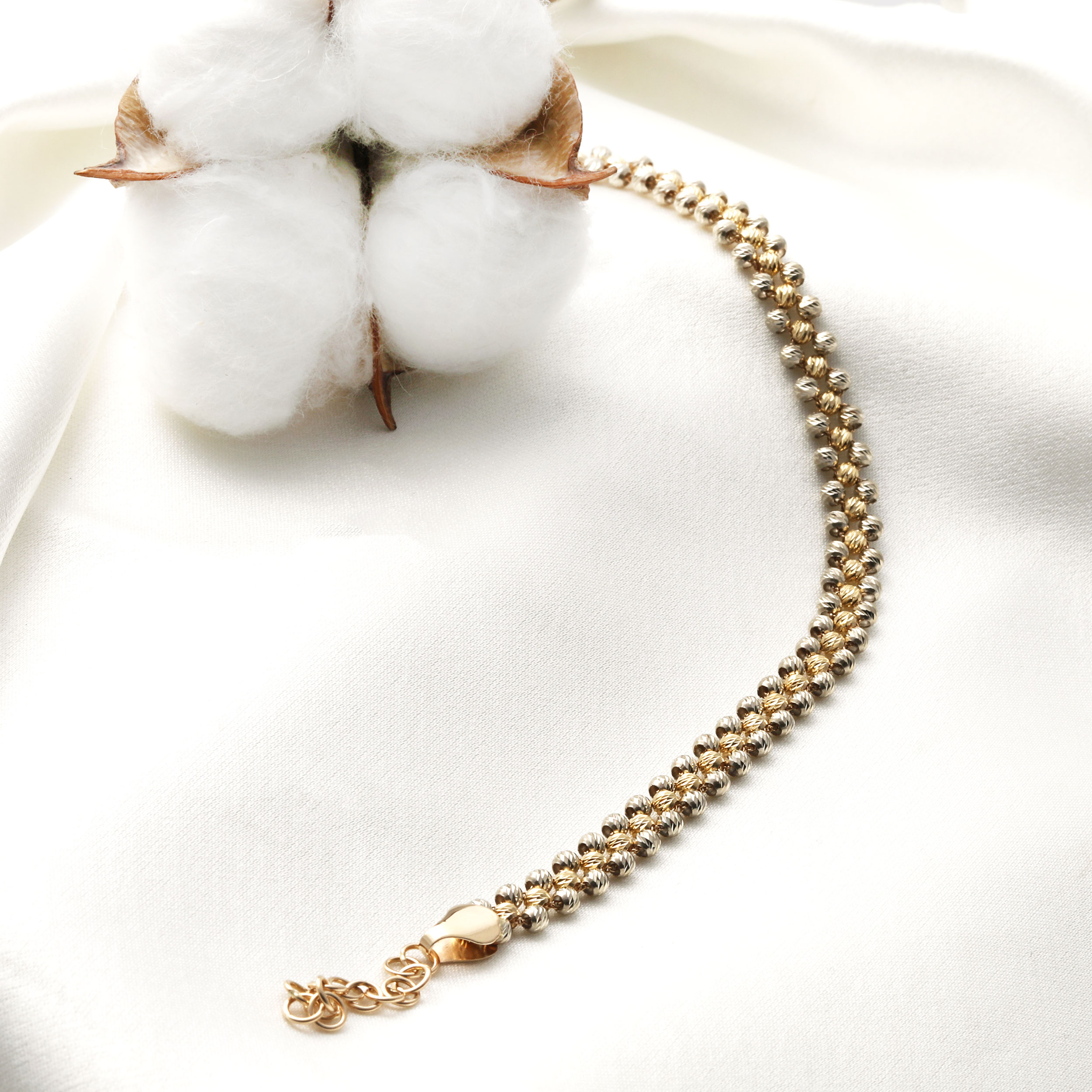 - دستبند بافت البرناردو الی دو رنگ سفید طلایی شامل زنجیر قابل سایز با رولو از حدود 16 تا 19.5 و به پهنای حدود 0.6 سانتی متر می باشد.